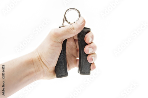 Man's hand with hand expander, hand gripper on white background. Hand grip strengthening tool