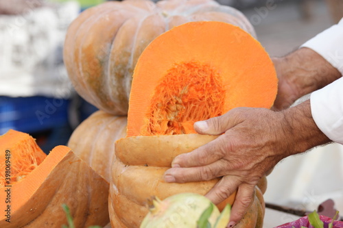 Mans hands holding pumpkin at market stall. Farmer selling sweet pumpkin close up.