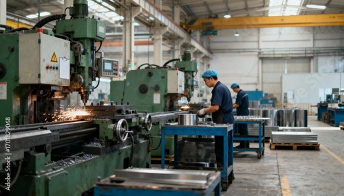 Manufacturing Plant Interior with Workers Operating Lathe Machines, Metalworking Industry, Industrial Production