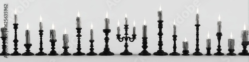 Many black candleholders with lit candles