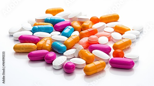 Many colored capsule pills on white background. Neural network ai generated art