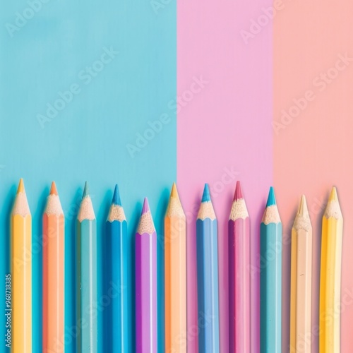 Many colorful pastel pencils on color background, drawing supplies banner, children paint, drawing school