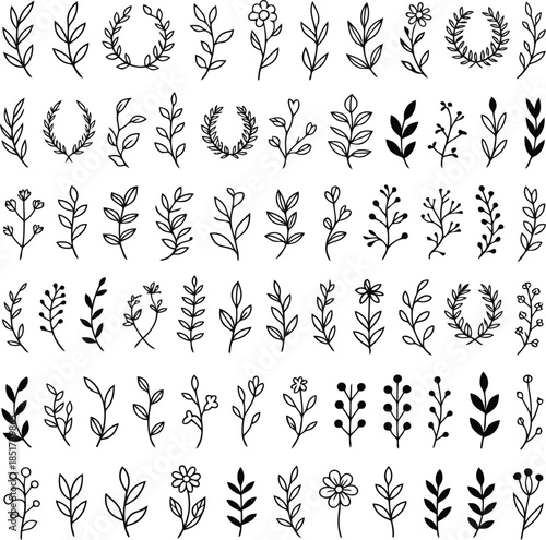 Many diverse hand drawn botanical elements such as branches, leaves, and small flowers are displayed together