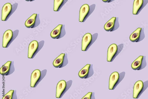 Many halves of avocado, pattern, banner. Blank bright background, blue purple pastel color.
