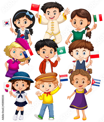 Many kids holding flag from different countries
