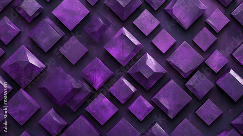 Many symmetrical purple rhombuses and squares on a black background. Bright abstract pattern of geometric carved and fancy shapes.