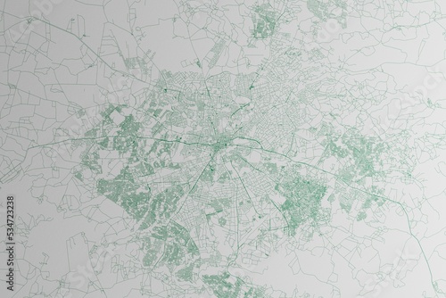 Map of the streets of Harare (Zimbabwe) made with green lines on white paper. 3d render, illustration