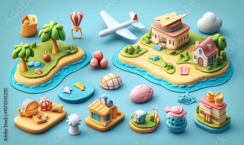 Map pointers, 3d vector cartoon icon set. Graduation hat, beach umbrella, fork and spoon, airplane, tree, bed, shopping basket, building