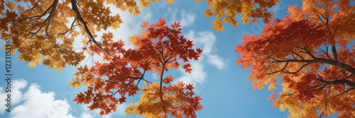 Maple tree with changing leaves against a blue sky, maple, leafy