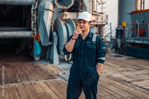 Marine Deck Officer or Chief mate on deck of offshore vessel or ship , wearing PPE personal protective equipment - helmet, coverall. He holds VHF walkie-talkie radio in hands.