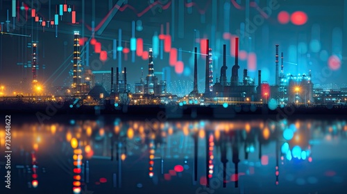 Market chart and stock index information against city lights and power plant. Dynamic banner for industry and financial success