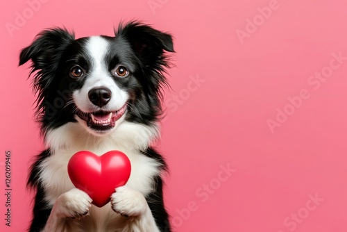 Marketing conceptual art. Border collie - my cherished dog. Cute border collie canine with domestic animal toy red heart - symbol of love, funny greeting card. Dog and heart. Love animals.