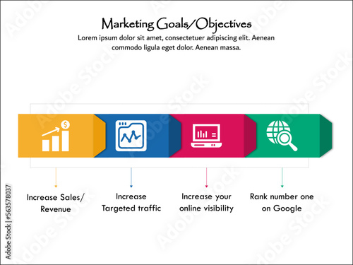 Marketing Goals/Objectives with icons and description placeholder in an infographic template