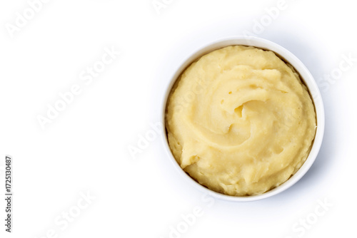 Mashed potatoes in white bowl isolated on white background. Top view. Copy space