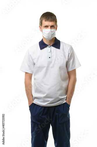 Masked doctor thrust his hands into pockets isolated on white
