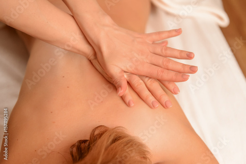 Massage therapy session Hands-on treatment for back pain relief slender Caucasian woman. Massage, health, wellness.