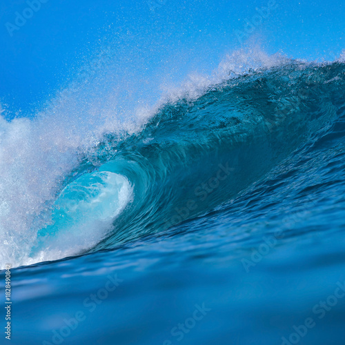 Massive blue ocean wave curling, bright turquoise barrel breaking with foamy crest and spray, sunlight
