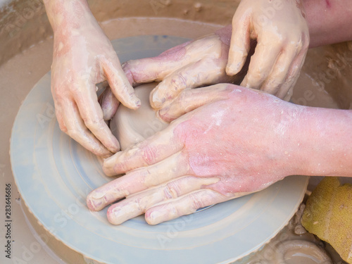Master class on modeling of clay on a potter's wheel In the pottery workshop for children sunny day four hands. Concepts: handmade, studying, master class, workshop, pottery, skill, creativity