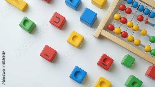 Math learning tools like abacus and number cubes on white background
