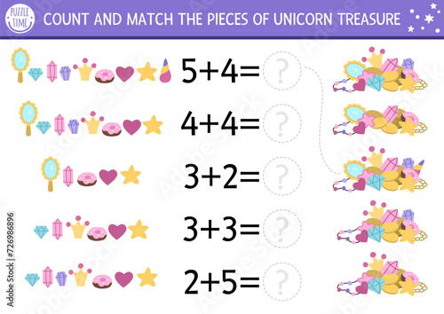 Mathematic game with cute unicorn treasures. Magic, fairytale math addition activity for preschool children. Simple fantasy world printable counting worksheet for kids. How many crystals.