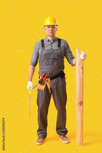 Mature carpenter with hacksaw and wooden plank on yellow background