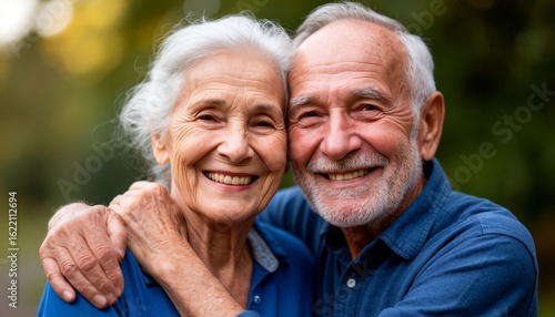 Mature couple hugging warmly, radiating happiness while basking in sunlight, sharing tender moment during leisurely park walk celebrating lifelong partnership