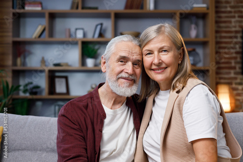 Mature happy couple smiling at the camera with a dazzling smile, beautiful teeth. Gray-haired husband and wife embrace each other. Relationships of happy seniors