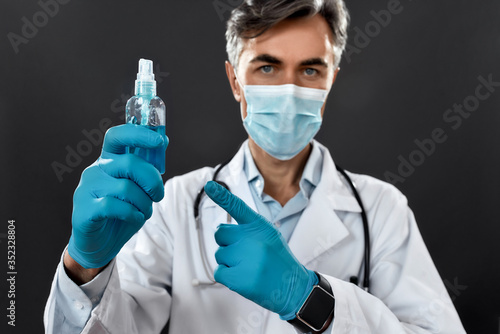Mature male doctor in uniform and medical mask pointing at antiseptic gel or sanitazer while standing against black background