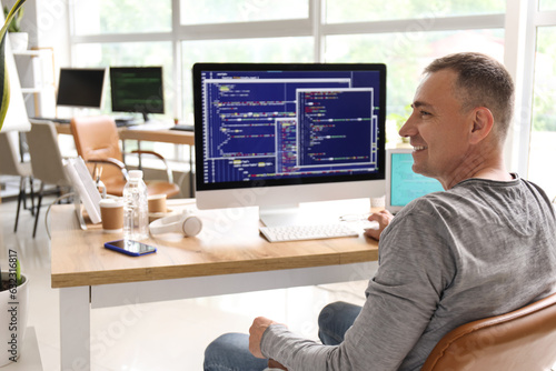 Mature male programmer sitting in light office at his workplace