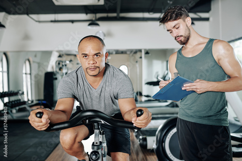 Mature mixed-race man riding fast on stationary bicycle in gym, his personal trainer taking notes in document