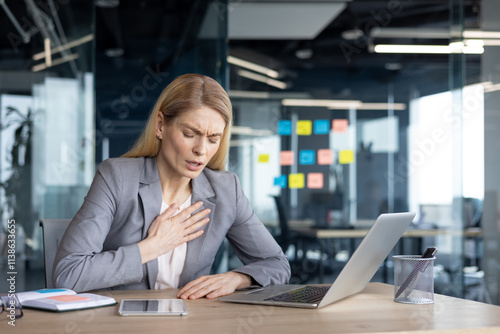 Mature woman businesswoman clutching her chest in discomfort at her office desk. She sits amidst work equipment, expressing serious concern.