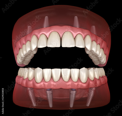 Maxillary and Mandibular prosthesis with gum All on 4 system supported by implants. Medically accurate 3D illustration of human teeth and dentures
