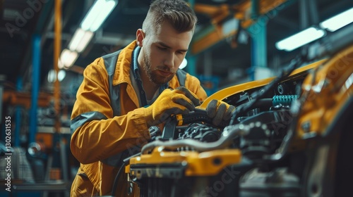 Mechanic in bright yellow jacket working on electric vehicle battery in equipped automotive workshop