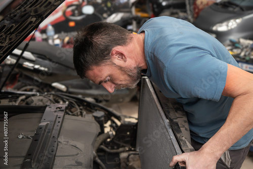Mechanic Installing Radiator in Car at Auto Repair Shop