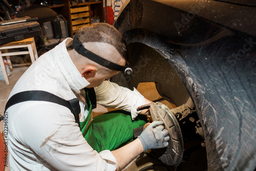 Mechanic Performing Brake Maintenance in a Dimly Lit Garage