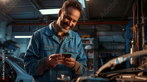 Mechanic Smiling at Smartphone