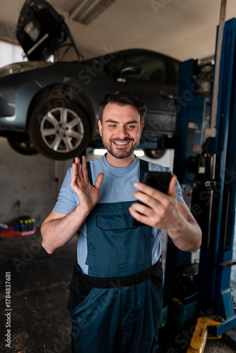 Mechanic uses smartphone to communicate while working on a car in repair shop
