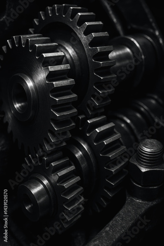 Mechanical metal gear wheels interlock precisely in this close up of industry technology parts working together smoothly in dark environment