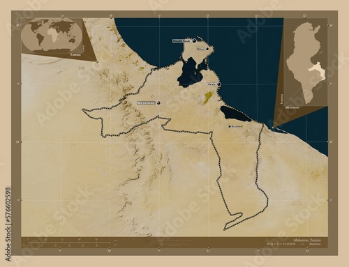 Medenine, Tunisia. Low-res satellite. Labelled points of cities