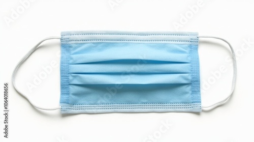 medical face mask on a white background, blue surgical mask with ear loops, detailed fabric texture, neatly folded pleats, neutral studio lighting, isolated image with no additional objects