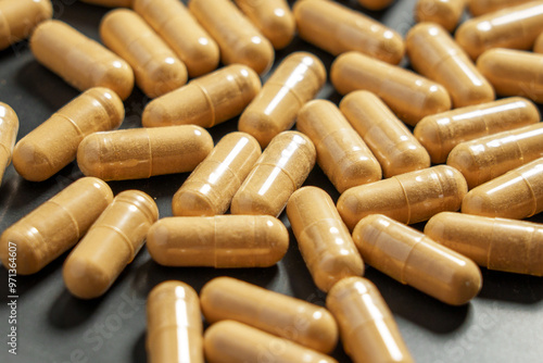 Medical Herbal Adaptogenic Ashwagandha Capsules in Black Plate.