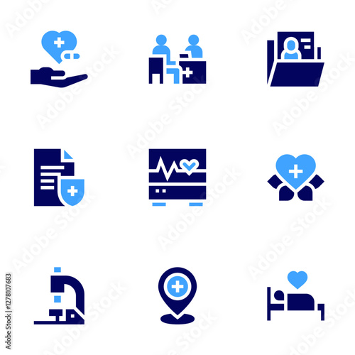Medical icon set. Bold style. Duotone colors. doctor consultation, ecg, treatment, medical record, insurance, daily health app, microscope, placeholder, hospital bed