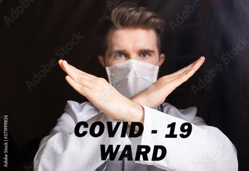 Medical male doctor wear a mask to prevent coronavirus 2019 and standing and raising hand to show the symbol of wrong. Concept of preventing infectious diseases. Isolation ward.