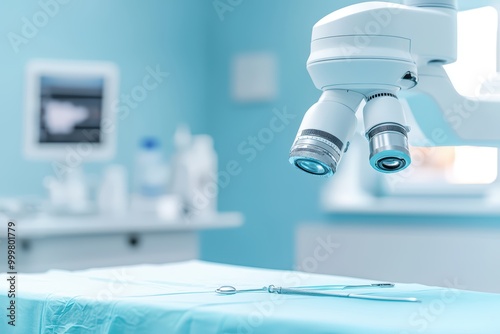 Medical microscope in a bright laboratory setting.