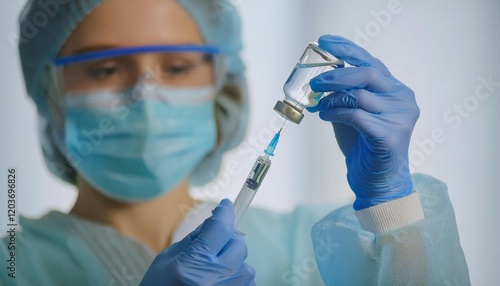 Medical Professional Preparing Vaccine In Laboratory Setting During Daytime With Safety Gear And Equipment
