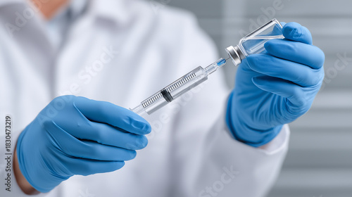 Medical professional preparing vaccine or medication with syringe and vial, filling liquid medicine for injection, global vaccination program concept with copy space