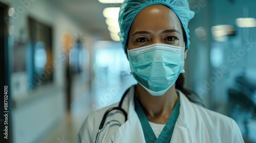 Medical professional wearing mask for protection against COVID 19 in hospital setting with ample space for text and emphasis on communication