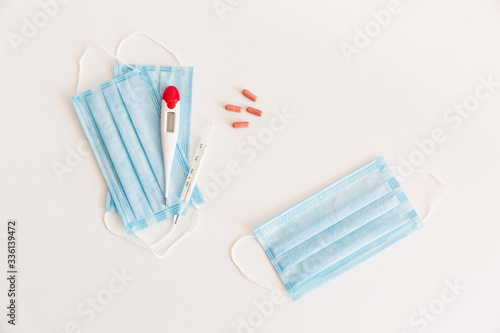 Medical protective mask with a thermometer on white background with pills. A disposable surgical face mask. Healthcare and medical concept.