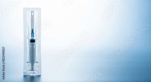 Medical syringe in sterile packaging for vaccination and injection procedure. Healthcare tool for treatment and medicine. Essential instrument for hospital and clinic use.