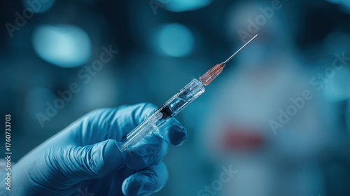 Medical Syringe with Needle Held by Doctor in Blue Gloves in Laboratory